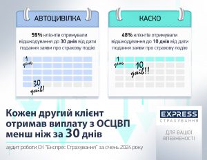 СК «Експрес Страхування», що входить до сім’ї групи компаній УкрАВТО, провела аудит роботи за січень 2024 року і проаналізувала строки виплат страхового відшкодування з автострахування. Так, за договорами ОСЦПВ кожен другий потерпілий (59%) в січні 2024 року отримав виплату менш, ніж за 30 днів, тоді як законом встановлена норма – 90 днів. Крім того 48%…